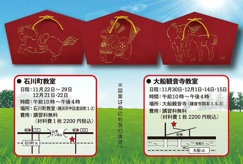 今年も干支絵馬製作の無料講習会を開催致します。 道具などは全てこちらでご準備しております。 毎年ご参加の方も、初めてご参加の方も 心よりお待ちしております。 |